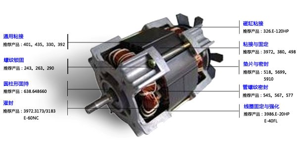 通用粘接 推荐产品:401.435.330.392 螺纹锁固 推荐产品:243.263.290 圆柱形固持 推荐产品:638.648.660 灌封 推荐产品:5091.3173/3183.E-60NC 磁缸粘接 推荐产品:326.E-120HP 粘接与固定 推荐产品:380.498 垫片和密封 推荐产品:518.5699.5910 管螺纹密封 推荐产品:545.567.577 线圈固定与强化 推荐产品:3985.E-20HP .E-40FL