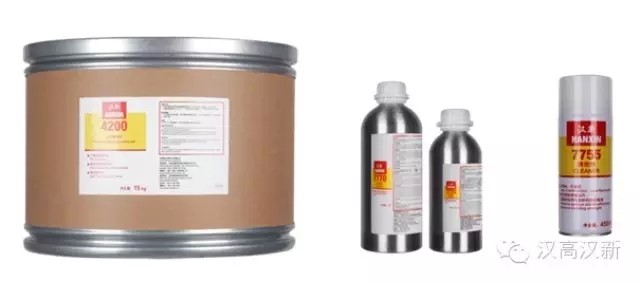 可重复使用 ▪高绝缘性 ▪疏水性 ▪高温稳定性 可以充分的填充电缆连接器并很好的粘接于接头粘接处,与电缆接头常用的塑料材质具有较好的相容性。使用此封装材料可以很容易的在更换或维护电缆接合时实现重复利用。 汉新 4200 热熔填充胶 清洗剂 汉新®清洗剂7755专用于金属加工业、工厂车间、铁路和船舶业的零部件的装配清洗和维护。 ▪具有以下特点 ▪快速挥发无残留 ▪不易燃 ▪低毒 不含三氯乙烷 促进剂 汉新®7764促进剂可以使非活化表面活化:铝、不锈钢、镁、锌、黑色氧化物、镉、钛表面等;加速固化速度,使紧固件可以迅速恢复使用;在较大间隙与较深螺纹中,使固化速度加快;可以大大提高寒冷部件上的固化速度;也可用于清洗剂。 汉新 7764 促进剂 底涂剂 汉新®7770产品用于使聚烯烃与其他低表面能量表面适合使用汉新氰基丙烯酸酯胶粘剂进行粘接作业。 汉新®7770产品只适用于包括聚乙烯、聚丙烯、聚四氟乙烯(PTFE)以及热塑性橡胶材料在内的较难粘接基材作业。不建议将汉新 7770聚烯烃底涂剂产品应用于有高剥离强度要求的装配作业。 汉新 7770 底涂剂 .